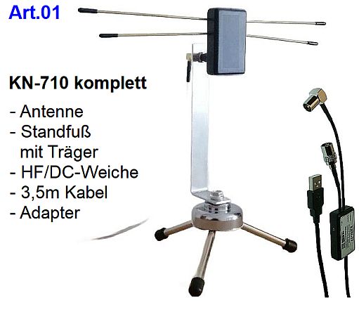 Die KN-710 und 712 können mit- und ohne DC-Weiche geliefert werden. Wählen sie den entsprechenden Kauf-Button (Art.01/02 oder Art.15/16). Überprüfen sie ihren Receiver/DVBT-USB Stik oder TV-Gerät, ob im "MENÜ-Sendersuche" eine 5V-Aktivierung für Aktivantennen möglich ist. Für diesen Fall benötigen sie keine DC-Weiche.